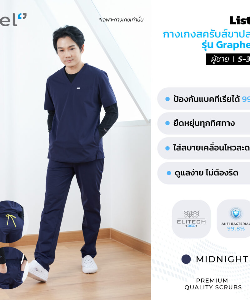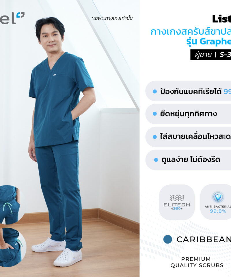 เนื้อผ้าใส่สบาย ชุดสครับส์ที่ยืดหยุ่นได้ทำให้การเคลื่อนไหวคล่องตัว ด้วยเทคโนโลยี ELITECH 360 ยับยาก แห้งไว และเนื้อผ้า มี เส้นใย “กราฟีน” ที่ฝังอยู่ในผืนผ้า ซึ่งช่วยยับยั้งการเติบโตของแบคทีเรียได้กว่า 99.8%