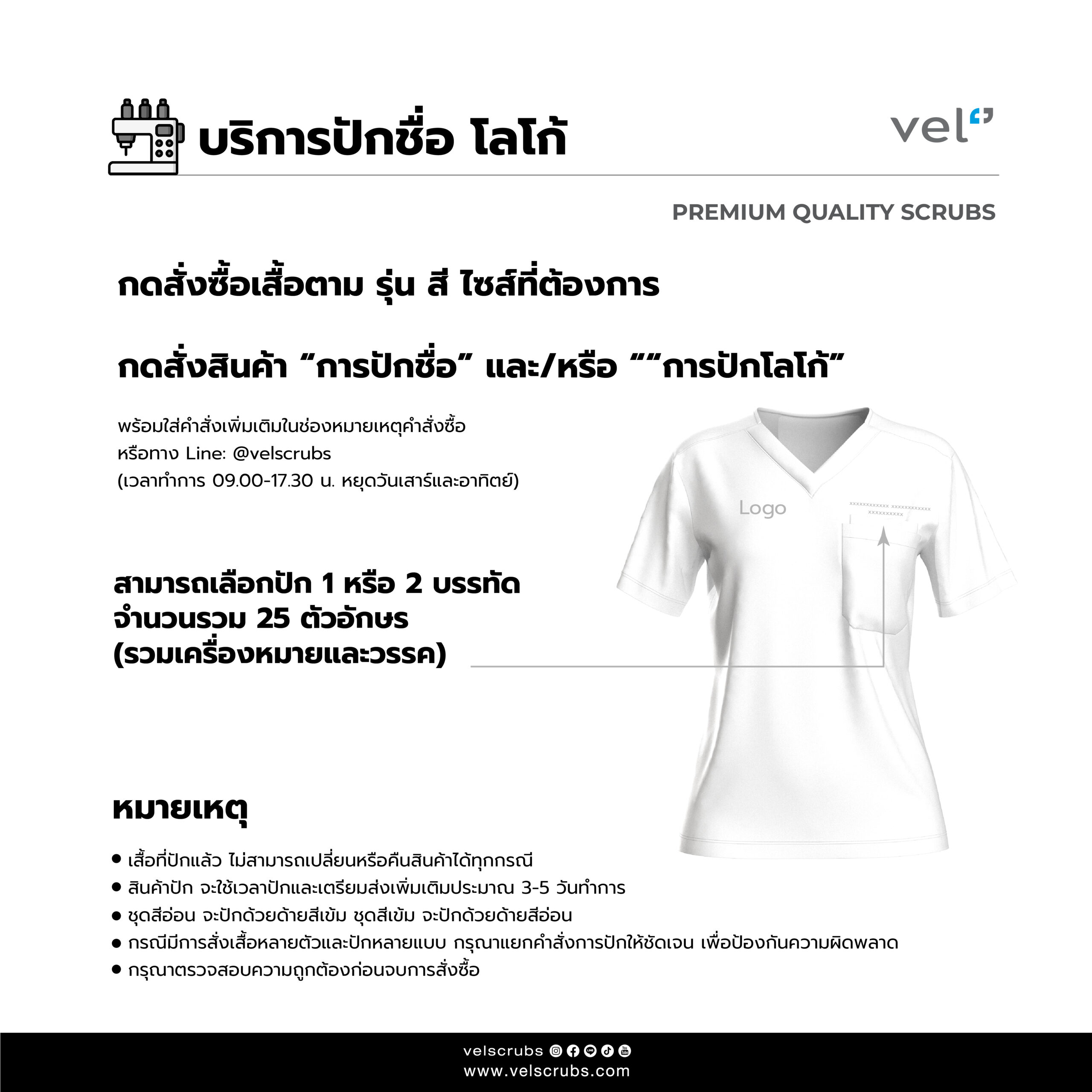 - เพิ่มการปักชื่อด้วยการกดสั่งสินค้า “การปักชื่อ” ไว้ในออเดอร์เดียวกันกับเสื้อรุ่นที่ต้องการ พร้อมใส่คำสั่งเพิ่มเติมในช่องหมายเหตุคำสั่งซื้อ หรือทาง Line: @velscrubs (เวลาทำการ 09.00-17.30 น. หยุดวันเสาร์และอาทิตย์)