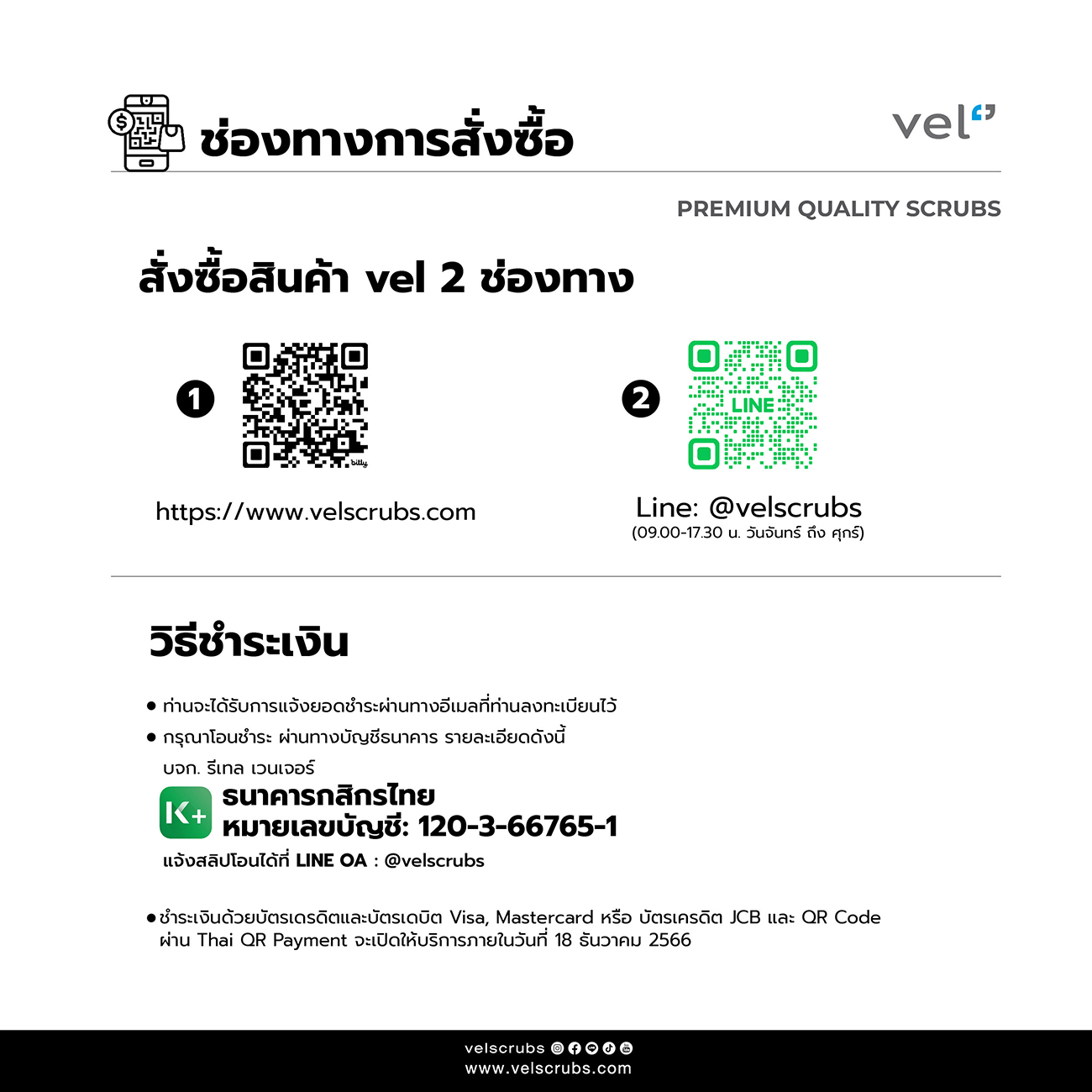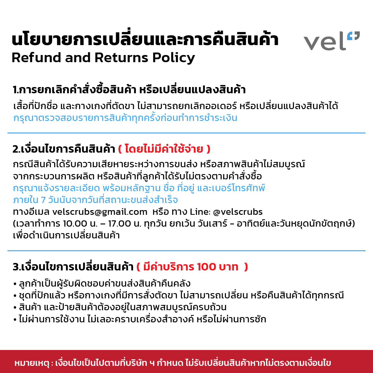 หากมีข้อสงสัย หรือต้องการสอบถามข้อมูลเพิ่มเติม กรุณาติดต่อมาที่ Line: @velscrubs (ในเวลาทำการ ตั้งแต่ 10.00 – 17.00 น. เว้นวันเสาร์–อาทิตย์ และวันหยุดนักขัตฤกษ์)